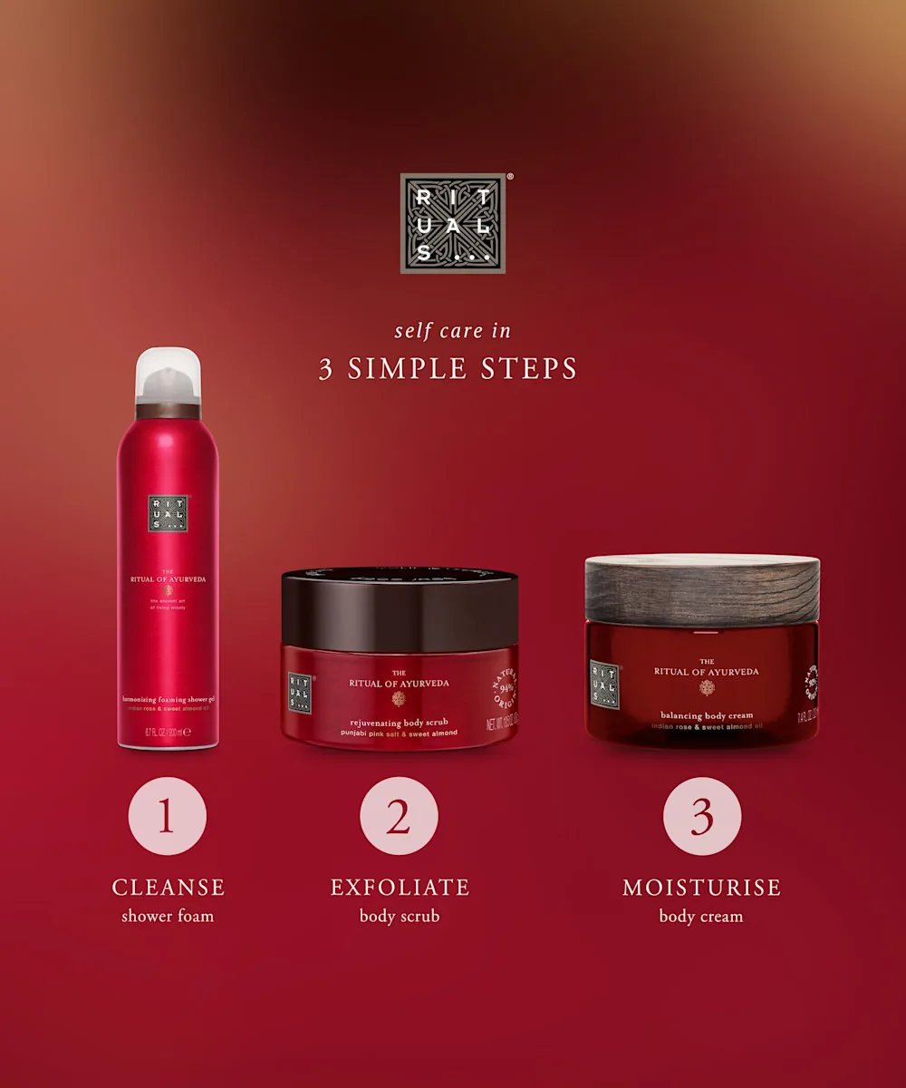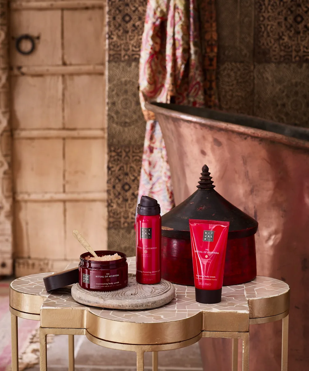 - The Ritual of Ayurveda Body Scrub (125g): A gentle and nourishing skin-softening body scrub enriched with rock salt, sweet almond oil and Indian rose.